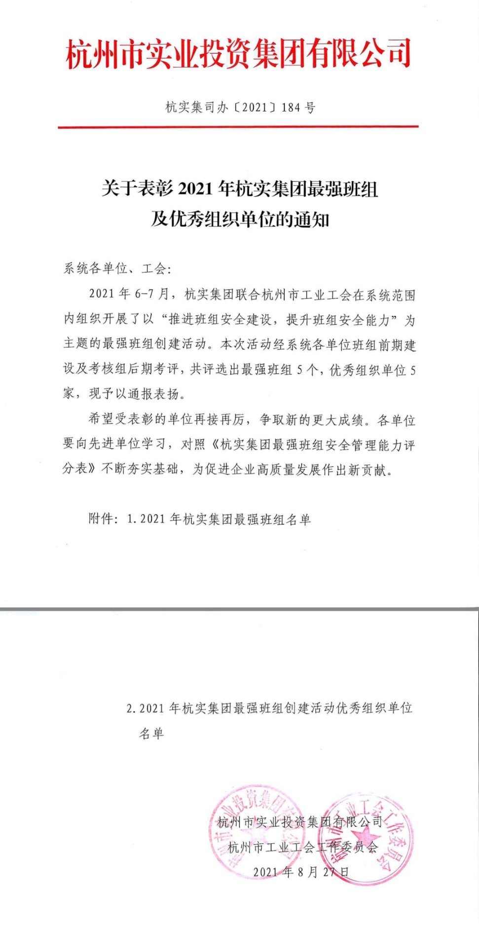近日,在杭实集团、杭州市工业工会联合开展的,以“推进班组安全建设,提升班组安全能力”为主题的最强班组创建活动中,B体育官方网站氯碱分公司氯装置班组脱颖而出,荣获“最强班组”荣誉称号,集团公司斩获“优秀组织单位”荣誉称号。